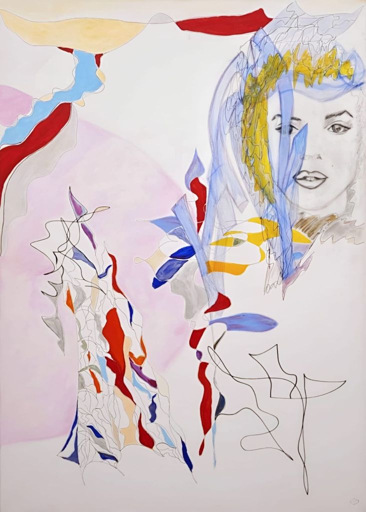 Besonders hervorzuheben sind die Porträtkompositionen ikonischer Persönlichkeiten im Retro-Stil von Elisabeth Sabo, in denen sich meditative Stille mit eindringlicher Ausdruckskraft verbindet. So vereint ihr Gemälde „Marilyn Monroe“ (verschiedene Techniken auf Leinwand, 140x100cm) abstrakte und figurative Elemente in einem filigranen Geflecht aus Formen und Linien. Das mit Bleistift gezeichnete Gesicht erzeugt durch die reduzierte Darstellung eine eindringliche, beinahe verletzliche Präsenz.
