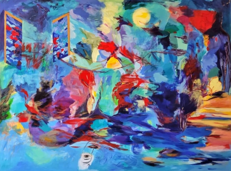 Aufgewühlte Farbbewegungen und fragmentierte Formen verdichten die Naturgewalt der Flut zu einer expressiven Bildsprache. Das Bild vermittelt die emotionale Verarbeitung zwischen Zerstörung und Erinnerung.
